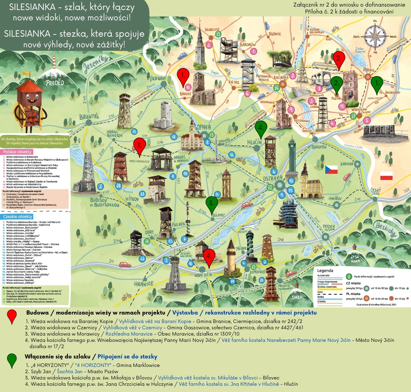 • KA 3.6) začlenění již existujících objektů do stezky, jejich zahrnutí do propagace tištěných materiálů, nabídek výletů apod. Týká se objektů 1) Obec Pszów - věž "Szyb Jan" v areálu dolu Anna 2) Věž kostela v Bílovci 3) Rozhledna v Marklowicích "4 HORIZONTY" 4) Věž farního kostela sv. Jana Křtitele v Hlučíně