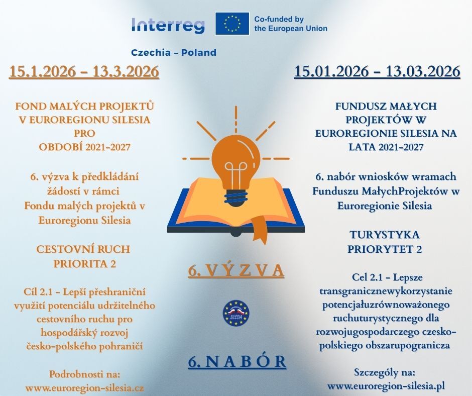 Dnešním dnem, 15. 1. 2026, vyhlašujeme v pořadí 6. výzvu k předkládání žádostí o podporu v rámci Fondu malých projektů v Euroregionu Silesia v Prioritě 2 "CESTOVNÍ RUCH" - cíli 2.1 - Lepší přeshraniční využití potenciálu udržitelného cestovního ruchu pro hospodářský rozvoj česko-polského pohraničí